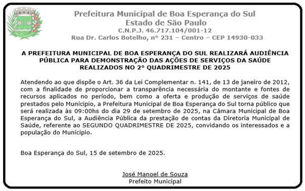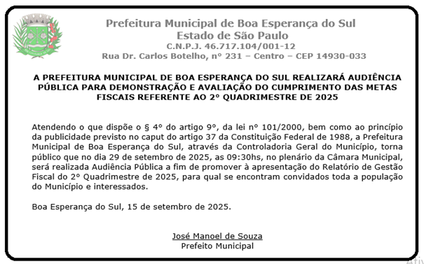 A PREFEITURA MUNICIPAL DE BOA ESPERANÇA DO SUL REALIZARÁ AUDIÊNCIA PÚBLICA PARA DEMONSTRAÇÃO DAS AÇÕES DE SERVIÇOS DA SAÚDE REALIZADOS NO 2° QUADRIMESTRE DE 2025 E AVALIAÇÃO DO CUMPRIMENTO DAS METAS FISCAIS REFERENTE AO 2° QUADRIMESTRE DE 2025