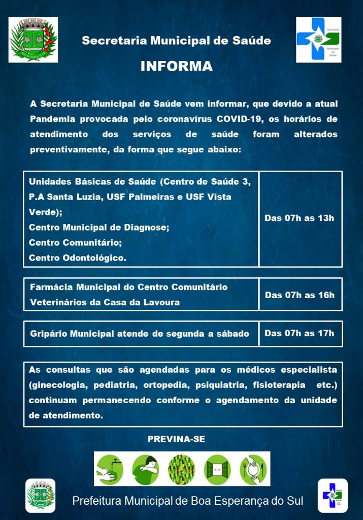 A Secretaria Municipal de Saúde vem informar, que devido a atual pandemia da COVID-19, os horários de atendimento dos serviços de saúde foram alterados preventivamente, da forma que segue abaixo: