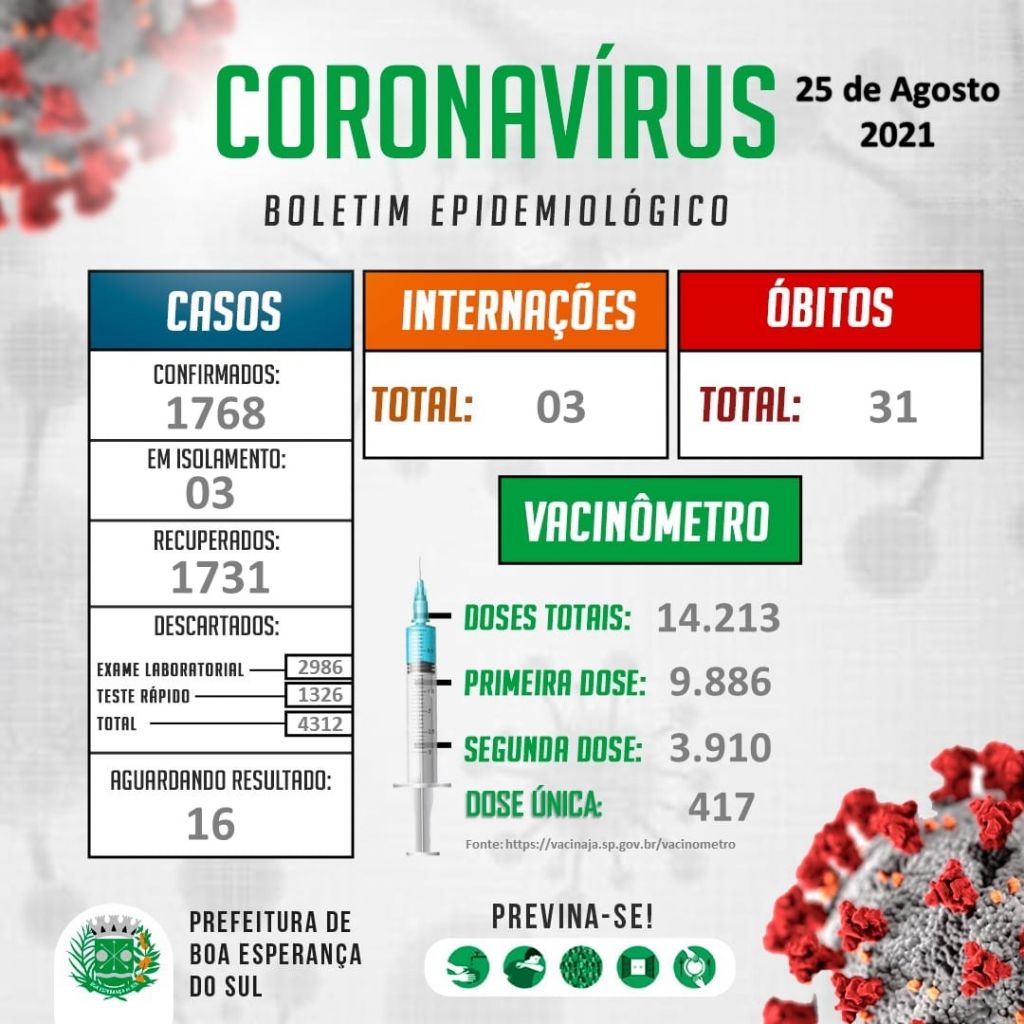 O boletim desta quarta-feira, 25 de Agosto de 2021, informa que registramos mais 01 caso de coronavírus no município.