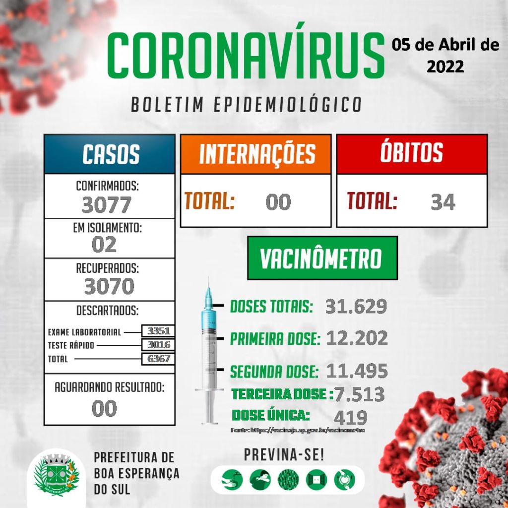 O boletim desta terça-feira, 05 de Abril de 2022, informa que registramos 02 casos de coronavírus no município.
